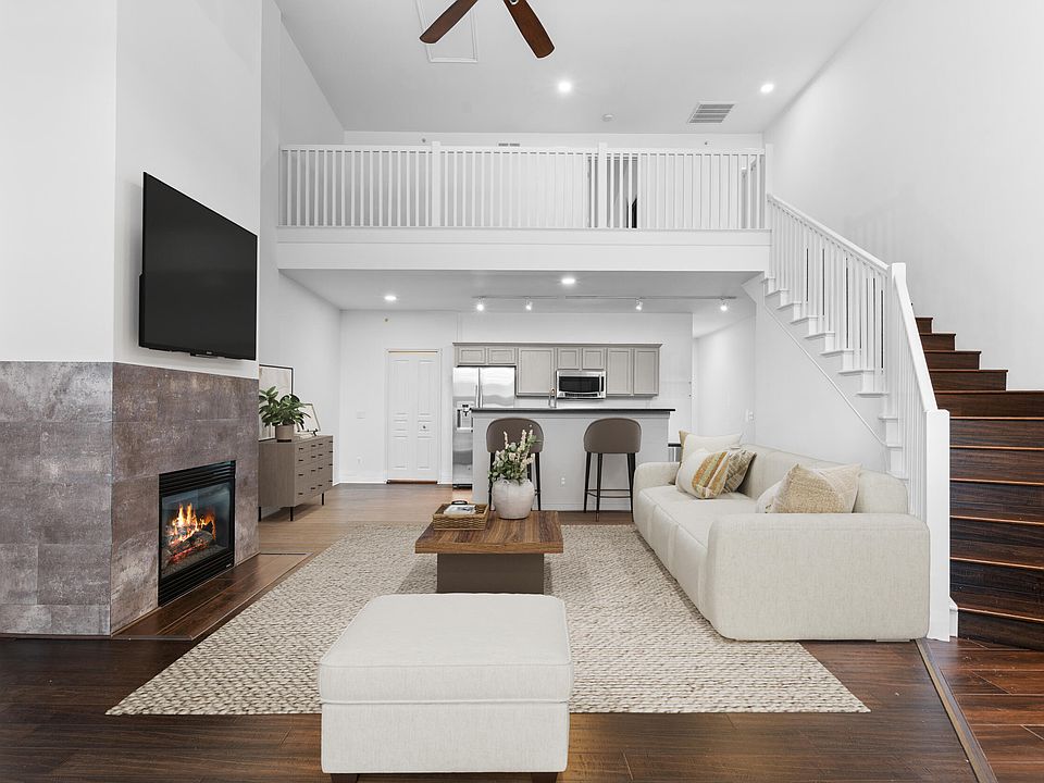 Cozy fireplaceFresh interior paintHardwood floorsInviting open-concept layoutGranite countertopsSpacious kitchenLarge private balcony