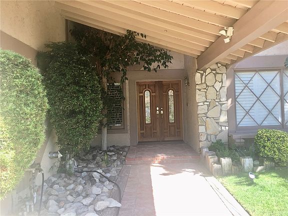 Lovely single-story Porter Ranch home Located North of Rinaldi and East of Wilbur. This beautiful home offers double door entry, three car garage, high ceiling, wood burning fireplace, planation shutters, French doors, newly remodeled kitchen with newer appliances and quartz counters, indoor laundry, great floor plan with large master suite and direct access to private tropical yard with lush landscaping and sparkling pool and spa, looking for shade, there's retractable awning. The property is located close to the freeway and the Porter Ranch Country Cub. The wall for 3rd and 4th bedroom has been removed and can easily be converted back by new owner.