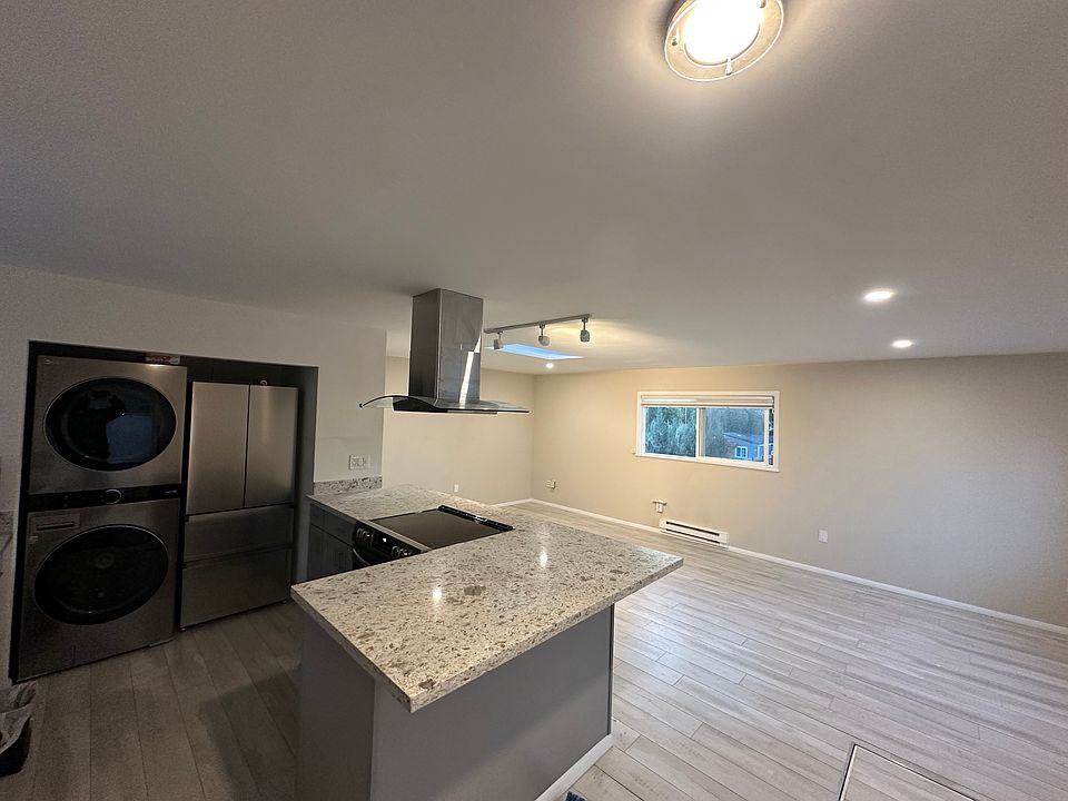 Bright, tastefully remodeled 2BR/1BA unit on a quiet residential street with tons of natural light featuring remote-operated skylight, an open living/kitchen with quartz countertop , in-unit washer/dryer, private entry, and easy street/driveway parking; convenient to parks, shops, and minutes from I-5 & 405 available now, message for details.