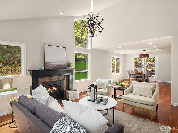 Welcome home! This charming rambler is filled with natural light and inviting vibes! Vaulted ceilings and hardwood floors create an airy, low-maintenance space, while the cozy gas fireplace adds warmth and comfort. You'll love the spacious kitchen and living areas—perfect for entertaining! French doors off the dining room open to a sunny deck, beautifully landscaped yard, and total privacy. Two large bedrooms each have their own bath. A/C for year-round comfort. The oversized garage offers plenty of room for cars, storage, or a workshop. All this in a quiet neighborhood with a playground, tennis, and sport court—just minutes from Downtown Kirkland, I-405, and trails. Pre Inspected. No Rental cap