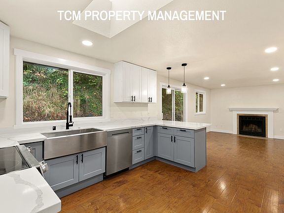 Cozy fireplaceSleek modern cabinetryStylish tile workRemodeled kitchenLarge windowsLed lightingEngineered hardwood floors