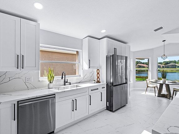 Welcome to your dream home in the picturesque Valencia Lakes! This BEAUTIFULLY RENOVATED 3-bedroom, 2-bathroom residence offers unparalleled lake views, arguable the best in the community. NEW 2025 AC. Step inside to an open floor plan adorned with exquisite marble-style porcelain flooring that seamlessly flows throughout all living spaces. Chef's kitchen, featuring brand new Samsung stainless steel appliances, kitchen island, ample storage, and sleek recessed & pendant lighting. It's the perfect space for culinary creations and entertaining guests. Retreat to the luxurious primary suite, where relaxation awaits. Indulge in the separate soaking tub or the walk-in shower, complemented by his and hers vanities, offering both convenience and elegance.