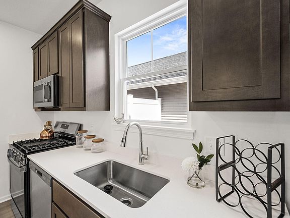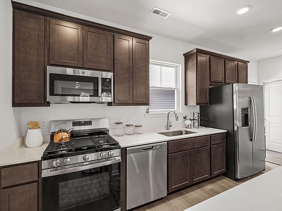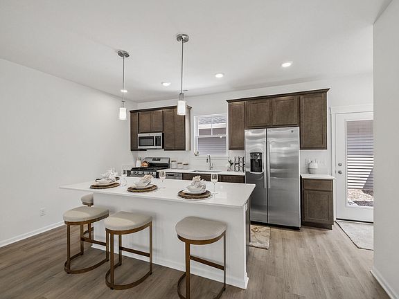 Welcome home to the Wyatt townhome! This home offers a spacious main floor with 9' ceilings! The kitchen features a large kitchen island with overhang, an abundance of storage including a 5' pantry, and stainless-steel kitchen appliances including a refrigerator. There are 42" cabinets and quartz countertops. Off the kitchen you will find the private fenced in patio that leads to the oversized 2 car garage. There are two spacious bedrooms and laundry with washer and gas dryer on the 2nd floor. Luxury vinyl plank flooring throughout the main living area and upgraded carpet on the 2nd floor. The Ring doorbell, and year-round low maintenance landscaping w/irrigation complete this move in ready townhome. Enjoy peace of mind with home warranties along with an industry best customer care program. Visit Walkerton Park to see your new home!