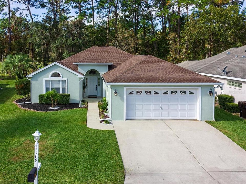 Imagine yourself lounging in the screened lanai as you enjoy the beautiful view. This pristine 2 bedroom 2 bath, 2-car garage home is located on the 5-hole and boasts newer fans, newer carpet, newer tile and the interior is painted with neutral color-scheme to make decorating a breeze. This home also features newer stainless steel kitchen appliances & kitchen cabinets (replaced in 2019), the roof was replaced in 2021 with 50-year architectural shingles, and has Newer hot water heater (replaced 2021), and the A/C is only 10 years old. Freshly pained exterior and landscaped front yard offers an enhanced curb appeal. Relax and enjoy the amenities because the lawn care and irrigation water are part of your HOA. This is a 55+ gated community, loaded with amenities, including three Recreation Centers. The community has indoor and outdoor pools, two fitness centers and over 80 clubs and activities. Close to medical, retail and restaurant.