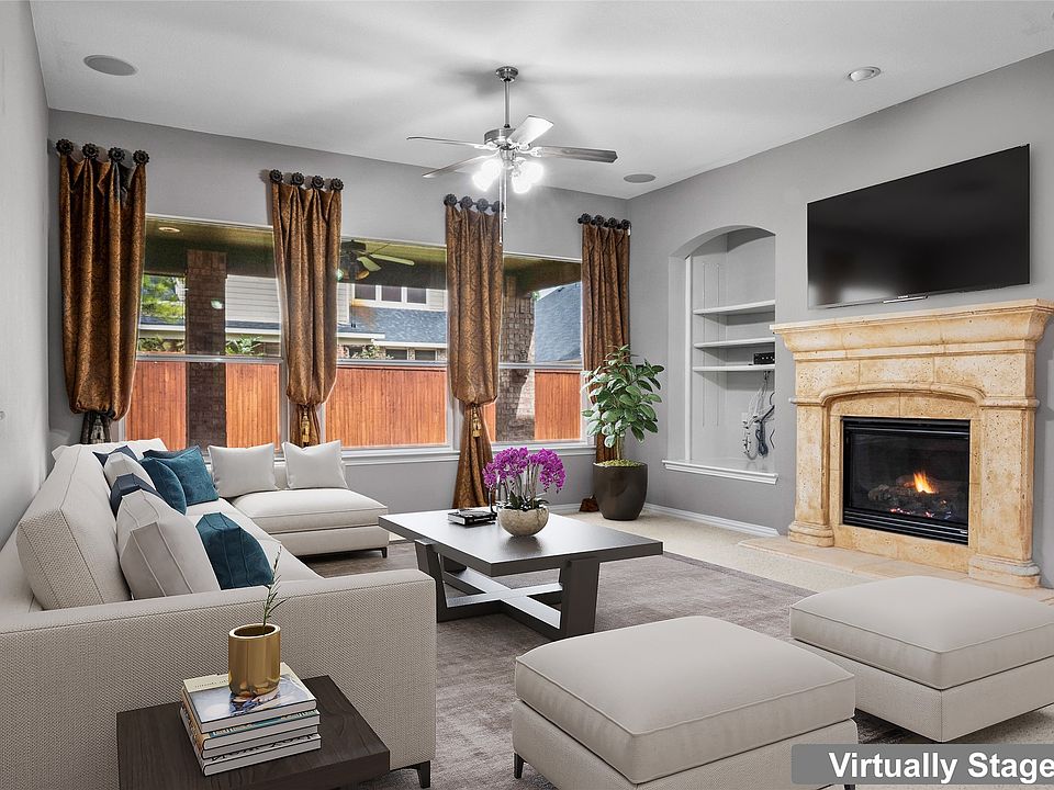 $50,000 PRICE ADJUSTMENT. Motivated Seller. Get ready to decorate for the Holidays with this perfect multi-generational David Weekly home in the resort style Lantana community, offering 5 sparkling pools, 2 fitness centers, pickleball, tennis and basketball courts, scenic parks and miles of walking bike trails in this master-planned community. The home features TWO primary bedrooms en-suites, both with garden tub, separate shower and walk-in closets, a spacious living room with a cozy gas fireplace perfect for hanging the Christmas stockings. Enjoy a dedicated office with French doors. The formal dining room showcases tray ceilings and a chandelier. The deluxe eat-in kitchen is a dream featuring a large island with special hanging lights, granite countertops, 42-inch cabinets with appliance garage and GE Profile appliances with a convection double oven, built-in 5 burner gas cooktop, microwave, and dishwasher. A double Kohler SS sink with Kohler fixtures adds the perfect finishing touch. There is a generous 5 shelf pantry. The dedicated media room with surround sound comes complete with an 80-inch screen and seating for the ultimate movie nights. With 3,279 sq. ft. of living space, this home is designed for comfort and convenience, including the grand entryway, warm wood banister, with wood dowels, premium crown molding, 7-room sound system even in the garage and patio, multiple deluxe ceiling fans with lights, over-sized patio and a 3-car epoxy floor tandem garage perfect for a large SUV or truck with hot and cold sink and added electrical outlets. 2 ea. 50-gallon hot water heaters. Roof was replaced June of 2024. Recent wood fence. This home is the perfect multi-generational or older child needing their own space with two primary en-suite bedrooms, one on first floor and one on second. Living in Lantana offers resort style living with all the amenities, community events at Christmas, Halloween and more. It is an active community. Enjoy the outdoors to its fullest.