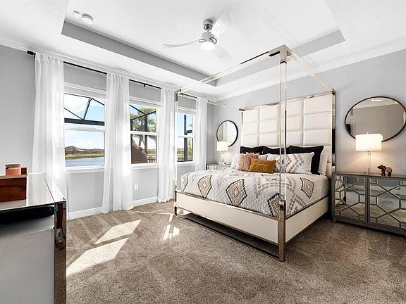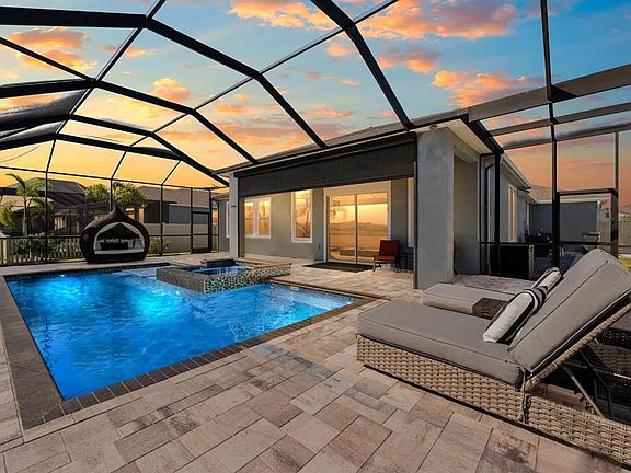 Incredible opportunity with a 2.25% assumable VA loan and paid-off solar panels that keep your electric bill around $15 a month! This beautiful 4-bedroom, 2.5-bathroom home with a 3-car garage perfectly combines affordability and luxury, featuring a heated pool and spa with a breathtaking 180-degree water view. Located in the sought-after Reserve at Pradera community, this home offers resort-style living and modern energy efficiency. The charming bungalow front elevation with a welcoming porch and Florida-friendly landscaping creates a warm first impression. Freshly painted inside and out, the home features 8-foot doors, crown molding, and elegant finishes throughout. The gourmet kitchen showcases upgraded cabinetry, an oversized island, and a walk-in pantry—ideal for both entertaining and everyday living. The open layout of the kitchen, dining room, and family room provides sweeping views of the backyard oasis, where the screened lanai, pool, and spa overlook the serene water. The owner’s suite is a luxurious retreat featuring tray ceilings, a garden soaking tub, dual sinks, and a seamless glass shower. The fourth bedroom with double doors makes a perfect office, gym, or guest room with plenty of natural sunlight and an open, airy feel. Additional bedrooms offer flexibility for family and guests. This energy-efficient home includes an insulated 3-car garage with epoxy flooring, a water softener system, and well-planned landscaping and drainage for easy maintenance. Conveniently located near shopping, dining, and major highways, this home truly defines where luxury meets affordability in The Reserve at Pradera.