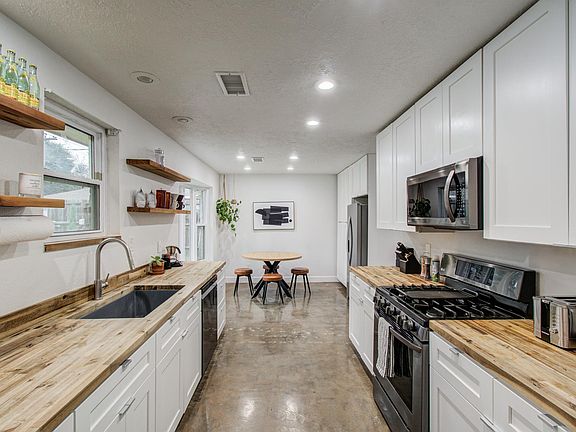 Step into this stylish galley-style kitchen, where modern design meets rustic charm. Featuring exposed shelving and warm wood accents, it's as inviting as it is functional. The sleek layout maximizes space, making meal prep a breeze, while the open shelving keeps essentials within easy reach. This thoughtfully designed kitchen is perfect for whipping up meals or simply savoring your morning coffee in a space that feels like home.