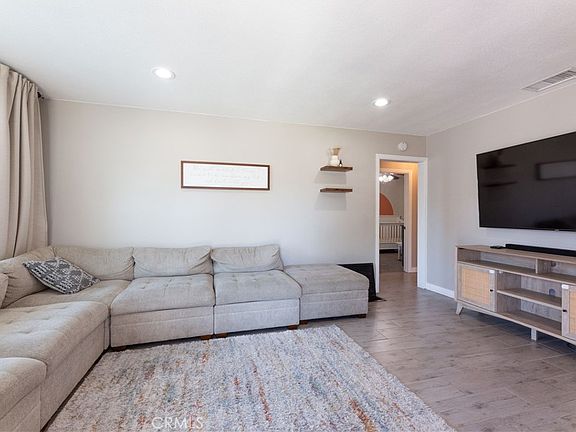 Welcome to this beautifully updated home that exudes charm and comfort. Thoughtful renovations throughout ensure a cozy and practical living environment with central air. Step inside to find a delightful kitchen that overlooks the spacious backyard, featuring a large covered patio perfect for outdoor gatherings. The patio includes strategically placed drains and special lighting, creating an ideal setting for entertaining. Both the front and back of the home boast lovely brick porches with brick accents in the concrete, adding to its character. Inside, enjoy modern conveniences such as copper plumbing, Milgard double-paned windows, and wood-design tiled floors. Both bedrooms are equipped with carpet, mirrored closet doors, built-in shelving, and ceiling fans for added comfort. Additional upgrades include a newer water heater, water softener, and an upgraded electrical box. The durable 50-year roof provides lasting protection. The updated bathroom showcases a charming tile design, complemented by a nearby dressing area with extra storage. Sprinkler systems in the front and backyard will keep your lawn and beautiful Sago palms looking fresh all year, but if you're looking to add on to the spacious backyard, there is ample room for expansion, an accessory dwelling unit (ADU), or a pool. Perfectly located near freeways, schools, and shopping, this turnkey home is ideal for those seeking comfort, style, and convenience.