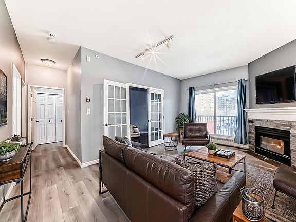 TOP FLOOR | FULLY RENOVATED | DOWNTOWN + RIVER VALLEY LIFESTYLE Live at the edge of the River Valley in this beautifully upgraded 2 bed, 2 bath condo in Victoria Promenade. This move-in-ready top-floor unit features a $30K custom kitchen makeover with stainless steel appliances, quartz counters, tile backsplash, and soft-close cabinetry. The open layout is filled with natural light and offers 9’ ceilings, new flooring, paint, and trim throughout. Enjoy downtown views from your private balcony, a gas fireplace for cozy evenings, and 2 full bathrooms with excellent separation between bedrooms. Includes 2 secure underground parking stalls (tandem) + storage. Pet-friendly building with rare amenities like a woodworking crafts room, games lounge, and more. Condo fee includes heat, water, reserve fund, exterior maintenance, snow removal & management. Quiet, well-run building just steps from the Promenade. Nothing to do but move in! (photos digitally staged or modified)