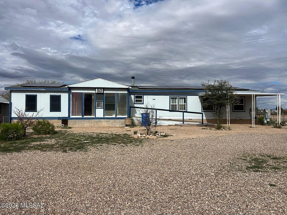 Enjoy peaceful desert living on 1 acre with this partially remodeled 4 bed, 2 bath manufactured home. Features include a freshly updated kitchen, spacious living room with dual side fireplace, Arizona room, and enclosed patio. Take in the stunning mountain views and gorgeous sunrise and sunset skies. Added peace of mind with a new roof, newer HVAC and newer water heater. Plenty of room for horses, RV, and all your toys. The perfect blend of privacy, space, and comfort-country living close to town amenities. Enjoy little to no electric bill! Seller has agreed to payoff solar! Being sold in as-is condition.