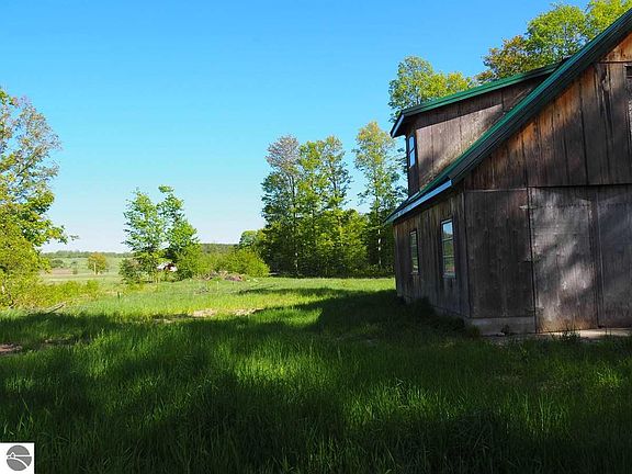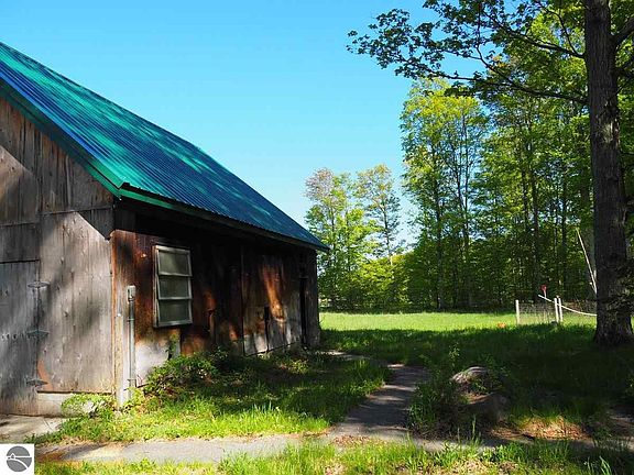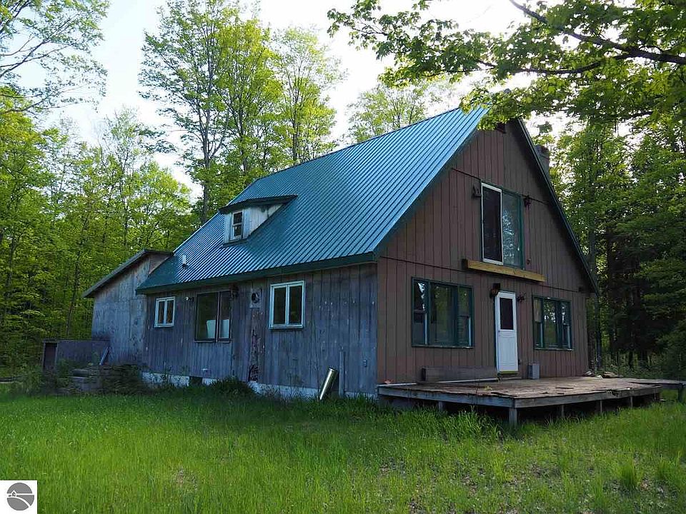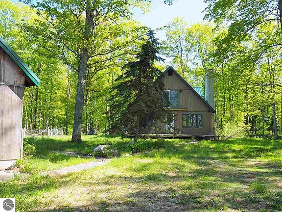 Bring your renovation ideas and toolkit to this three bedroom A-frame home and garage on 30 acres in north Benzie County, in a fantastic country location. This true handyman special is surrounded by hardwoods but has some countryside views and an open yard for gardening, playtime and barbecues. You cannot beat the location near thousands of state land acres and trails. And its only a few miles to Lake Michigan and Sleeping Bear Dunes National Lakeshore Park. Wood-sided house and two-story garage have new metal roofs but need to be stripped to the studs in places and finished on the inside. Lots of living space here with two bathrooms, a full basement, and a 16x30 addition in back with basement - the perfect design for a music/art studio or sunroom, guest quarters or mother-in-law apt. Features include a brick-surround fireplace wall, multiple windows and an updated well. This kind of acreage for sale is getting harder to find, especially west of County Rd 677. Get a head start on home ownership with a roof over your head, power, running water and LOTS of potential.