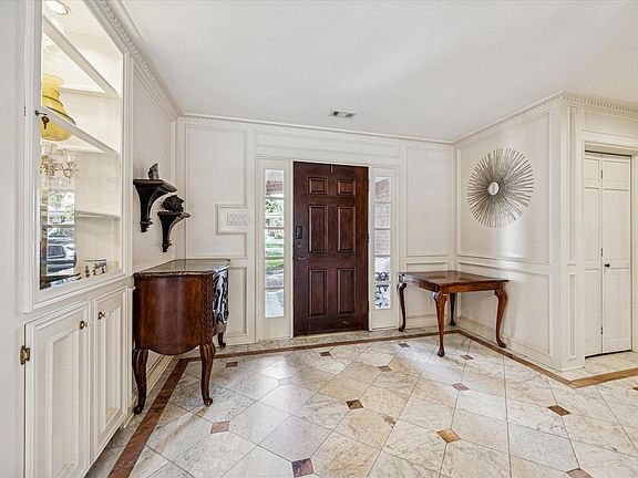 Home has circle drive and charming covered patio entrance. Situated on a spacious tree lined lot, the home is bright and filled with custom built-ins. It has Primary suite and home office on first first floor. Primary closet has built in floor safe and leads to workout room that can be converted back to a bedroom. Two spacious bedrooms are located upstairs with loads of built-ins and filled with natural light. The large sunroom overlooks the private backyard with its sparkling pool, green space and outdoor kitchen.