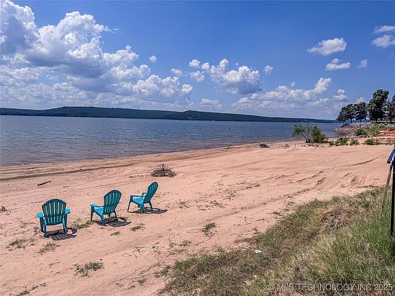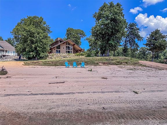 LAKEFRONT MASTERPIECE! This architecturally significant lakefront home was thoughtfully designed by Al Drap. This stunning property blends seamlessly into its surroundings, embodying the principles of organic architecture inspired by Fay Jones and Frank Lloyd Wright. From the moment you arrive, this home exudes intention, creativity, and craftsmanship. The central fireplace serves as the heart of the home, while every architectural decision made enhances both form and function. Natural light flows in from all sides, levels, and directions, creating a constantly evolving atmosphere throughout the space. The construction of the home is as impressive as its design. Beneath the structure lies a slab reinforced with over 1,380 pounds of steel rebar, meticulously engineered into a detailed grid for strength and stability. Additionally, the concrete-walled safe room, featuring steel doors, a reinforced ceiling, and a fortified floor, ensures safety and peace of mind, designed to withstand even the most severe weather conditions. Outside, you'll find a beautifully designed outdoor living space, perfect for soaking in the panoramic lake views, entertaining guests, or simply relaxing in peace. Situated on a prime lakefront lot with 100 ft of PRIVATE sandy beach right outside your door, offering immediate access to the shoreline, ideal for swimming, sunbathing, launching a kayak, or simply soaking in the peaceful lake views. The outdoor living area is equally impressive, offering space to relax or entertain. An outdoor shower offers the perfect way to rinse off after a swim or a day of fun in the sun. If you're searching for more than just a house—if you seek a standout property that honors the land, invites wonder, and tells a story, this LAKEFRONT home presents a unique opportunity. Schedule your private tour today and experience the perfect harmony of architecture, artistry, nature, and lake life!