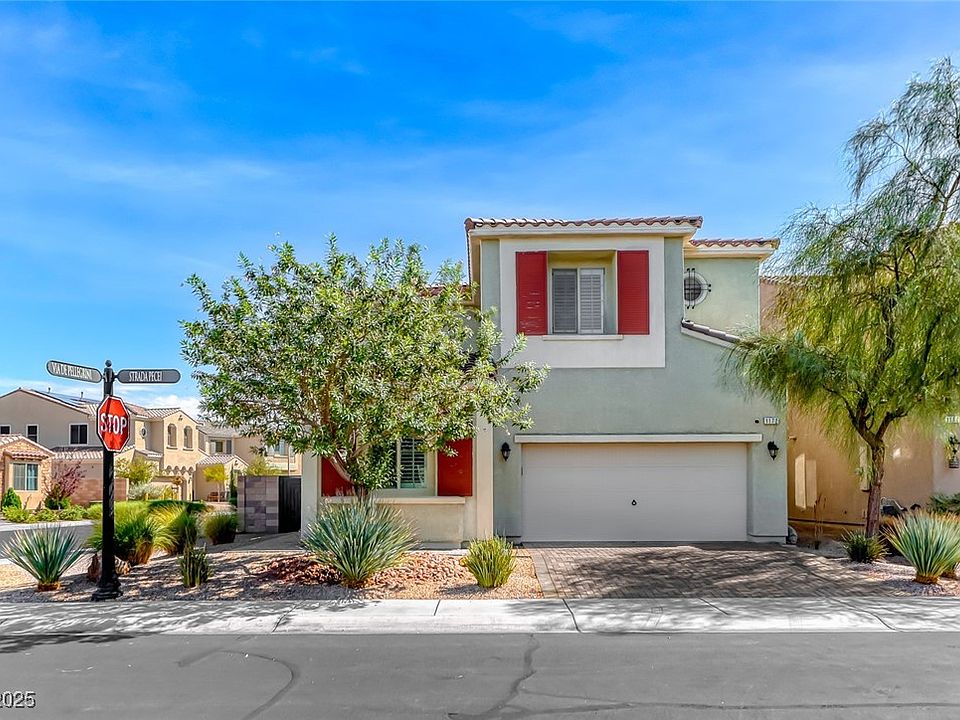 Premier Residence in Tuscany. Welcome to this guard-gated community in Henderson, centered around the scenic Chimera Golf Course. This stunning 2-story, 4-bed, 3-bath home on a corner lot blends comfort and elegance. Enjoy an open-concept kitchen, living, and dining space ideal for entertaining. The kitchen features stainless steel appliances, a center island with breakfast bar, quartz counters, and ample storage. A main-level bedroom and full bath offer added convenience. Upstairs, the spacious primary suite includes a large walk-in closet and en-suite bath. Relax in the private backyard with a covered patio and above-ground spa—perfect for gatherings. Tuscany features a 30,000 sq ft Recreation Center with state-of-the-art amenities, including a full-size gym, basketball/tennis/pickleball courts, resort-style pool and lap pool, arts, crafts, and more! Make this one yours!