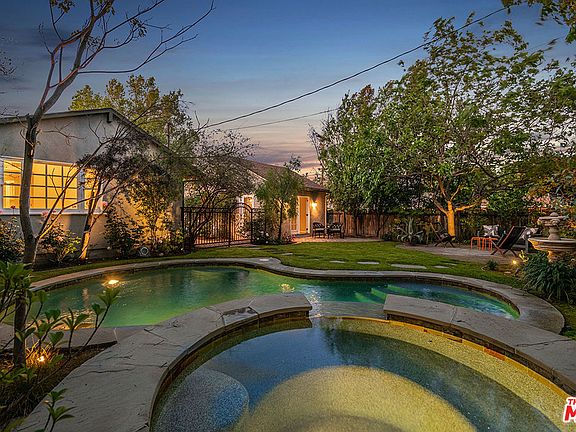 Charming Valley Village Traditional. Picturesque and updated for today's tastes with clean lines, hardwood floors and sunny spaces. Entertainer's plan has large living room with brick fireplace, formal dining room and spacious media/family room under vaulted ceiling with French doors to outdoors. Bright galley kitchen with s/s appliances incl. gas range, glass-front cabinets and easy underfoot cork flooring provides streamlined function, generous storage and workspace. Light-filled bedrooms have hardwood floors. Bathrooms remodeled with new tile, fixtures, etc. Master has big walk-in closet complete with custom storage system. Private gated oasis features sweeping patio with covered area for grilling/dining plus beautiful pool and spa! Fully landscaped with rose gardens. Modern detached office/studio with separate entrance, raised beam ceilings, hardwood flooring, bi-fold French doors and private patio. Excellent schools, shopping and dining in a wonderful community.
