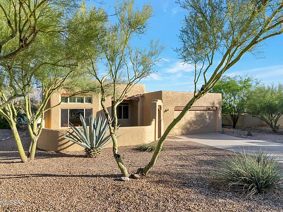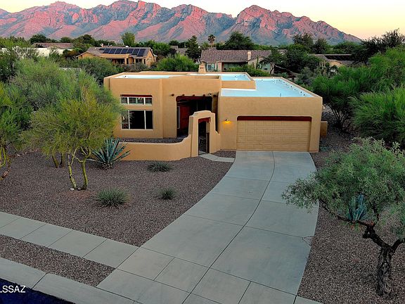Welcome to Oro Valley (Tucson) Arizona living as it was designed to be enjoyed. This exquisite 4 bed/2 bath Tucson Spanish Pueblo Styled home sits on .35 acres of natural desert landscape. You will beam with pride knowing you own a TJ Bednar Custom Built Home. Enjoy a private driveway, gated front courtyard with rustic iron features & groomed Palo Verde trees. Delight in custom timber beam vigas as you enter into the 12ft ceiling family room with customer pine door. Savor earth tone diamond laid tile, expansive kitchen with remodeled eat-in Granite counters, new upper/lower cabinets, sink, new GE appliances - microwave, ovens, gas stovetop, hood vent, dishwasher, warm kiva beehive gas fireplace. Newer WH, HVAC, New exterior paint & stain. Bathroom upgrades. Majestic Catalina Mtn Views. HOME!