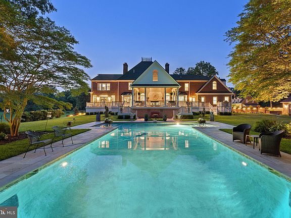 Flent Hall, a stunning Colonial Williamsburg-inspired home, originally built in 1990, has been lovingly remodeled inside and out during the past four years. Situated on 20 manicured acres in the Old Dominion Hounds hunt country and in an area of numerous protective conservation easements, this all-brick wonderful country house is immaculate in its many luxurious offerings. One enters the two-story reception hall featuring a grand staircase. From there, one finds the 22x23 great room with floor to ceiling stone, woodburning fireplace, numerous sun-burst windows, and access to the rear porch. Off to the left is the open, fully-fitted and recently remodeled 17x31 kitchen with lots of table space, Italian Fulgor Milano appliances, Kraftmaid cabinetry, marble and quartzite counters, Blanco sinks and Brizo faucets, two kitchen islands and a woodburning fireplace. Nearby is the 16x17 dining room, 35x14 family room with French doors to the porch, the cozy library with woodburning fireplace and a powder room. There is a full bath off the kitchen that also serves the pool. Up the grand staircase (there is also a back staircase that comes down to the kitchen) one finds the 20x26 primary bedroom, 3 walk-in closets, lots of windows taking in the view, a woodburning fireplace and an exceptional bath with two hammered nickel sinks, bidet, copper tub with hammered nickel finish and large shower. There is an upstairs reading room with fireplace and four additional bedrooms. On the lower level there is a full bath, bedroom with walk-in closet and lots of windows, 21x21 recreation room with fireplace, an exercise room and two large storage rooms. The well-appointed house features all new Jeld-Wen double paned windows, 6-woodburning fireplaces, solid wood doors throughout, 3 ½ inch gleaming oak floors, particularly fine bathrooms, total garaging for four cars, all brick and Hardiplank construction – all maintained on a very high order. The brick guest house offers completely redecorated quarters with full bath, woodburning fireplace and a new heat pump. There is a 2-stall brick stable with tack room, hay loft, an attached run-in and chicken coop, and two paddocks. The home is enhanced by the immense character of the grounds including a long, paved drive approach to a circular front parking forecourt, exterior lighting on the house and garden, a lion’s head fountain into a garden pond, brick potting shed, all new stone patios and sidewalks, a 46-foot pool with new gunnite, coping and tile, a 80-head sprinkler system – all bathed in bursting flower gardens and shrubs – the base structure of the garden having been designed by Caroline Tait, a Royal Horticulture Society (RHS) Hampton Court, Palace Garden Festival award winner. To take in the splendid rural setting, perhaps your favorite spot might be relaxing on the 21x22 resort-like covered rear porch overlooking pastures, pool, gardens and woodland. It features delightful Chippendale railings and Ipe decking – truly a first-class setting. 9.9 miles via Crest Hill Rd. to Rte. 66 at Marshall.