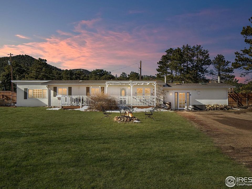 Live the Colorado ranching dream in the Rocky Mountains! Located in lower Coal Creek Canyon on all paved roads this rare single story sprawling ranch home is completely updated & turnkey. Situated on 1.75 acres on an entirely level & usable parcel this property offers a 912 SF garage/shop, barn w/ loft, carport/stall space, multiple outbuildings, 40' round pen and several different fenced areas for animals. Step into a spacious tiled entry and an expansive living room with hardwood flooring & a woodstove that can heat the entire house. An open floor plan guides you into an updated kitchen featuring quartz counters with bar-seating, bright white cabinets, T/G beetle-kill wood ceilings & one-of-a-kind stone backsplash that adds rustic mountain charm. The separate dining room adjacent to the kitchen features breathtaking mountain views with access to the front deck that receives all day sun. All bedrooms have hardwood flooring and the updated baths enjoy radiant heated floors. The primary suite features a generous-sized office, private bath with marble shower, vaulted T/G beetle-kill wood ceilings, walk-in closet & reclaimed wood floors from the 1800's, also with radiant in-floor heating. The large laundry room offers extra storage and backyard access that is separately fenced for pets. Incredible privacy surrounds this home with a 7' cedar fence and 5 separate fenced areas for animals, a chicken coop, playhouse and seasonal pond on the property. No need to leave home to experience adventure!