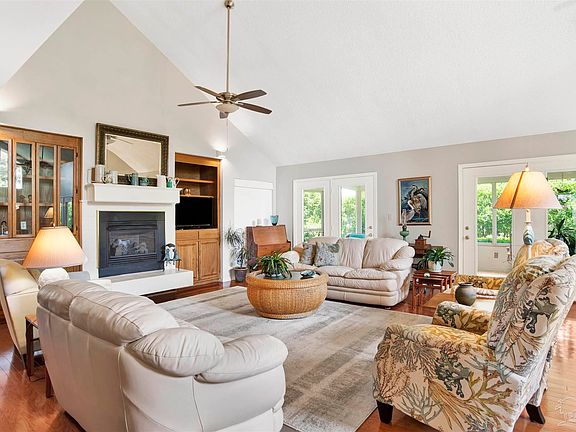 This 3 bdr/3 bath/2 halfs is not like the others. Some waterview on a high and dry large lot (huge backyard), with numerous gathering areas both inside and out. Added flexibility with an additional wraparound driveway perfect for parking your RV or boat, that leads to the garden area backyard complete with irrigation and outbuildings/greenhouse. The living room boasts a cathedral ceiling, hardwood flooring, gas fireplace, wet bar, and access to the oversized covered screen porch while flowing to the dining area. The kitchen includes a massive island, pantry closet, nook area that leads out to a covered porch and paver patio area, pull out drawers, and built-ins. The downstairs master suite has two closets (one a walk-in with built-ins), along with a make-up vanity desk, walk in tiled shower, and access to a covered patio. Upstairs finds two en-suite bedrooms. The East bedroom is oversized (21x12) with a tiled walk in the shower while also having access to the garage stairs and storage area/fitness space. The West bedroom has a tub shower, two closets and access to another walk-in attic storage area. The oversize garage includes a half bath (deep sink), and back staircase to a fully decked, high ceilinged storage area/fitness space. Other niceties include; a new roof and new hot water heater, HVAC in 2018, irrigation well with new pump, 220V exterior power on each side of the home, and exterior plantation shutters. Voluntary HOA with a waterfront lot to ICW.