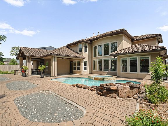 Summer kitchenHardwood floorsSparkling pool with waterfallsLight-filled living spacesOversized three-car garageExpansive closetsStately stucco and stone