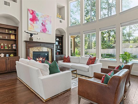 Stately stucco and stone Hedwig Village residence offers 5 bedrooms, 5.5 baths, and an ideal layout for both entertaining and everyday living. A grand double-door entry opens to soaring ceilings, a sweeping staircase, and light-filled living spaces. The kitchen features an oversized island with breakfast bar, double ovens, custom cabinetry, and two walk-in pantries, flowing seamlessly into the family and breakfast rooms. Interior details include hardwood floors, custom millwork, wine room, and a private study. The first floor hosts a luxurious primary suite with spa-like bath and expansive closets, plus a guest suite with backyard access. Upstairs offers three secondary bedrooms, a game room, and a media room. Outdoor living is a dream with a loggia, summer kitchen, and sparkling pool with waterfalls, spa, and fountain—all surrounded by lush landscaping. A circular drive and oversized three-car garage complete this exceptional home, located near premier schools, dining, and shopping.
