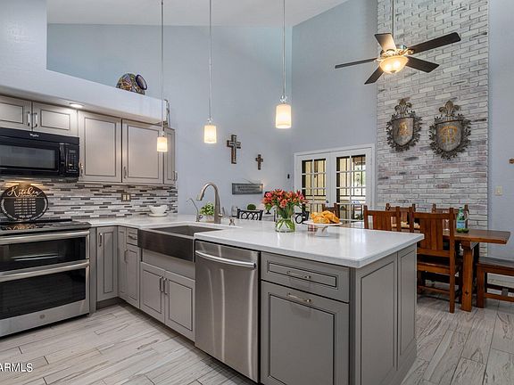 Discover the best price per square foot in the neighborhood! This beautifully updated home offers a low-maintenance yard and a prime location. The remodeled kitchen features custom cabinetry, quartz countertops, tiled wood-like flooring, brand-new stainless steel appliances, soaring ceilings, and a cozy fireplace. Enjoy meals in the dining area or at the breakfast bar. The bathrooms have been stylishly upgraded with step-in showers for modern convenience. French doors open to a private backyard oasis complete with covered patios and fresh turf.