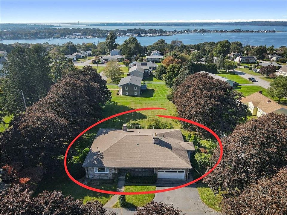 MID CENTURY VERY SPACIOUS RANCH WITH WATER VIEWS! Meticulously maintained and lovingly kept in classic 1960s style, this peaceful home has beautiful views of the Sakonnet River and the Mount Hope Bridge. Enjoy broad views from the spacious eat-in kitchen, dining area and from the sunroom/TV room with its wall of window. Step right out to a lovely private deck. Entertain in the very large living room highlighted by a (Tennessee) stone fireplace with built in shelves. Private hallway leads to the 2 generously sized bedrooms, tiled full bathroom with ample storage and huge laundry room with workspace and more storage! The lower level of this special property holds a very large finished and heated room with fireplace, space for office, dining, playing, theatre, exercise, pool table, etc! And, a fantastic 1960's wet bar makes for a perfect fun retreat! Basement bedroom and walk out to back yard finish this 2000+ sq foot space. Central air conditioning, 2 car garage, parking for 10+ cars. Pretty stone wall and mature trees. Nearly 3/4 acre lot! Furniture available/negotiable. Ready for sale!