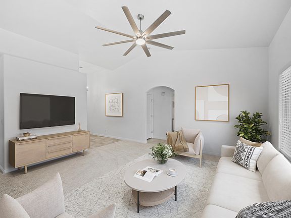 This lovely 3 bed 2 bath in Sedona Hills is move in ready! Brand new premium quality carpet and pad throughout. Fresh ceiling to floor interior paint with all new Modern Forms lighting fixtures and ceiling fans in each room. New recessed canister light installation in kitchen & dining compliment the vaulted ceilings creating a feeling of spaciousness and add character and light to the living space. Outside you will enjoy the private & quaint covered patio & the efficient xeriscape backyard. The HOA maintains frontyard landscape and common area grounds. This home is ready and easy to show! Call me for a showing today!