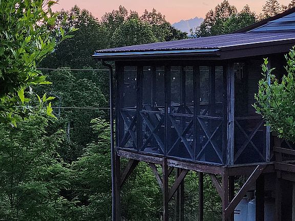 Welcome to your home on the top of Porters Mountain, approximately 10 miles east of downtown Roanoke, VA. This lovely cottage-style home began in the early 1900s as a hunter's cabin and has evolved into a tranquil, comfort-filled home, complete with unique rustic touches. Over the past four years, the home has undergone extensive work to make it a perfect sanctuary of peace, birdsong and wildlife: foundation work; a new heating and cooling system; optimization of the existing well; new posts supporting the overhanging screened-in porch; new leaf-gard gutters on the entire house; a master bath remodel that includes a walk-in tub, new vanity, and bidet; a complete overhaul of a cook's kitchen walls and will include a new GE dishwasher, 2023; 3 sets of new doors; a 75-gallon hot water tank with lifetime warranty; two storage rooms, one newly refurbished; new entry hall flooring; new large capacity washing machine and energy efficient dryer; extra water-proofing in the basement; plus fresh paint throughout. The kitchen cabinet pulls are brass deer heads from England, and the rustic lodge-style light switches and outlet covers are adorned with cutouts of Deer, Bears, Coyotes, and other creatures that inhabit the mountain. The two oversized bedrooms offer more than enough space for additional items like bookcases, seating areas, and more. The master bedroom features two oversized double closets, while the second bedroom has its own set of ample double closets. A highlight of the second bedroom is the new set of French doors, which open directly onto the screened-in porch, making the two spaces feel like one very large room that flows evenly between the two spaces. Exposed beams give the living room/ dining area a warm, country feel. The home's floor plan features an easy flow and never more than one step to maneuver, securing the feel of one-floor living. The large laundry room features a new, extra-large tub washer, an energy-efficient electric dryer, and a large coat closet. The second full bath is located in the same room as the laundry, with a full tub, bidet/ toilet combination, and double vanities painted by a local artist. A large asphalt apron on the west side of the house provides parking for 7+ cars, and decks on the east and west sides of the home allow a view of spectacular sunrises and sunsets. A newly graded driveway utilizes a small ditch lined with rocks to divert excess water from the main road and down the drive, and is in the final stages of completion. An outbuilding located at the end of the parking apron currently houses the owner's workshop, with winter-time heat provided by an oversized wood-burning stove. Attached to the back side of the building is a garage/barn for all your outdoor tools and riding mower. Landscaping includes spectacular flower beds in front of the home surrounded by a hand-made rock wall, butterfly bushes, 5 Rose of Sharon trees, a Crepe Myrtle and lilac bush, forsythia bushes, Honeysuckle and wild raspberries, a huge fruit-bearing blackberry bush in the garden bed in front of the house and two apple trees located beside the drive opposite the house. Select items of furniture may be available for the new owner to negotiate. With Lowe's, a Walmart SuperCenter, Kroger's, CVS, restaurants, and more, just 12- 15 minutes down the mountain, the location provides a "Get-Away" feeling with all conveniences just minutes away. If you have been looking for a safe place to raise children, enjoy a back-to-nature feeling, or retire to, this mountain-top home is surrounded by a close-knit community of neighbors, making it the ideal location for a quiet or adventure-filled life. With mountain view property at a premium, this lovely home won't last long. Call for a viewing ASAP! Home is sold As Is: all remodeling work is first-rate; inspection is paid for and done by the buyer for information only.
