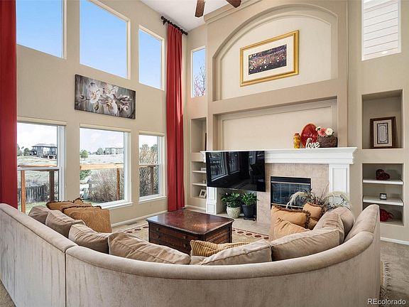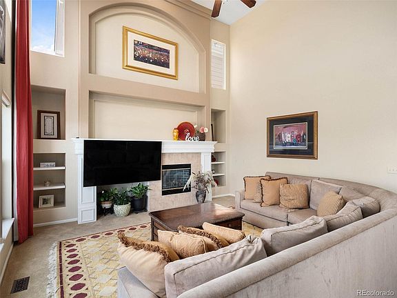 In the coveted Villages of Parker is a sprawling 2-story home that backs to open space providing a restful retreat that you can call Home. As you step inside you are embraced by soaring ceilings and a curved center staircase with iron balusters. The main floor wraps around to the kitchen that has captivating views of the open plains. Designed for convenience this kitchen features a center island, spacious pantry, breakfast nook and plenty of cabinet space. Stainless steel appliances and granite countertops complete this space. You will love to entertain gatherings of any size as the kitchen is open to the 2-story family room and also provides access to the large back deck. The main level also includes a formal living room, formal dining room, sun room and home office. Upstairs you will find the primary suite plus 3 additional bedrooms and 2 bathrooms. The primary suite is inviting – tucked behind double doors you have your own private retreat with gas fireplace and spa-like bathroom boasting dual sinks, large walk-in shower and treasured oversized soaking tub. The closet sizable and sports a built-in organizational system. The basement is the ideal recreation space with full wet bar to include dishwasher, refrigerator and microwave. There is room for a home theater, game room or in-home gym. Rounding out the basement is a bedroom, ¾ bathroom and laundry room/storage area. The backyard is serene with an expansive Trex deck, optimal for entertaining or relaxing. Unrivaled in location, you will enjoy easy access to trails, parks, and tons of shopping/dining on Mainstreet in Parker. Proximity to E-470 allows you to quickly reach DIA and provides convenient connection to other major highways. With highly desirable neighborhood and schools – this is an opportunity you don’t want to miss.