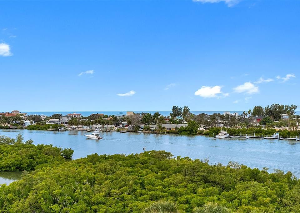 IT’S ALL ABOUT THE VIEW in this direct Intracoastal unit with fabulous Intercoastal & Gulf Views of blue and green as far as the eye can see! This 1225 sf 2 bed 2 bath condo is just waiting for a new owner! Living/Dining room combo with wet bar, LED lighting and wood flooring throughout offering amazing water views. Kitchen is a chef’s delight with extensive custom wood cabinetry, granite countertops, breakfast bar and best of all…Intracoastal and Gulf Views. Primary Ensuite with walk-in closet and double sink granite vanity bath sits directly on the Intracoastal with incredible views and balcony access. 2nd Bedroom is perfect for guests with walk in closet and direct second bath access. 2nd Bath is updated with granite, glass vessel sink and walk in shower. Washer & Dryer located in utility closet in kitchen. Condo conveys with storm shutters, 1 underbuilding assigned parking spot and 1 assigned 8x8 storage room. Shipwatch One is located in the Shipwatch 54 acre gated community with secured lobby access, plenty of guest parking and has a 2025 new roof. 2 small pets allowed 25 lbs.max. Shipwatch Yacht & Tennis Club (located just off Indian Rocks Beach) is a wonderful full-service waterfront private resort/complex on 54 lush acres with 2 pools and 2 clubhouses – one with full kitchen services & waterfront deck. Shipwatch offers 45-slip private marina(subject to availability) with guest parking, electricity, water and all the ice you need. Walking trails, exercise room, hot tubs, saunas, and 11 of the best Har-Tru clay tennis courts in the county with pro shop, viewing stands (tennis pro on staff) and massage therapist. Pickleball hardcourts are also available to owners. Lounge by the Olympic-size waterfront pool, exercise in the fitness center or heated lap pool or enjoy the sunsets from your living room, balcony, kitchen or primary bedroom. The sunsets and nature can also be enjoyed on any of the numerous walking and bike trail locations throughout the 54 acre development. Great relocation condominium especially for tennis or pickleball buffs, boaters or beach folks. Walking distance to the white sugar sand Indian Rocks Beach. Close to nightlife, shopping, post office, banking, dining, and so much more. TPA airport 40mins PIE airport 30min. It just doesn’t get any better than this…call today. Floorplan photo#42