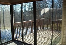 3 season porch, deck, and patio overlooks large green area and woods. Large family room has fireplace with stone surround.