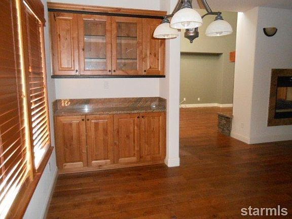 Very nice open floor plan. High ceilings throughout home. 2 separate master bedrooms with one located on first floor and one located on the second floor plus 2 more guest bedrooms. Very nice upgrades in the kitchen and 3.5 baths. Kitchen features slab granite and stainless steel appliances. Hardwood floors downstairs. 3 gas fireplaces. Nice setting within the HOA - This end unit condo is surrounded by an open greenbelt in the back and on the side for extra privacy.