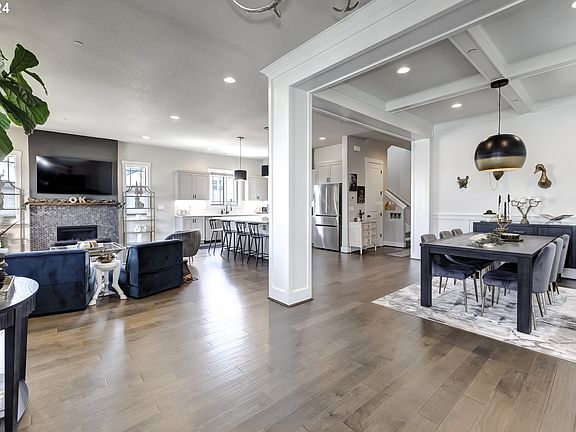4 bdrm + loft. This Villebois beauty has a spacious Great Room floor plan, gorgeous engineered hardwood floors & upgrades thru-out. Living room features custom fireplace surround w/live edge mantel. Dining room w/wainscotting & box beam ceiling. Kitchen has quartz countertops, large eating island, soft close cabinetry, convec oven & ss applcs. Primary ste has dual w-in closets, soaking tub & tiled shower. Charming front porch & backyard w/comp deck, gazebo & water feature. Custom blinds & designer lighting & fixtures. Garage w/PVC blk diamond floor, storage loft & lots of blt-in cabs, drawers & workbench. Hybrid gas water heater. A/C. Several parks walking trails & community events to enjoy!