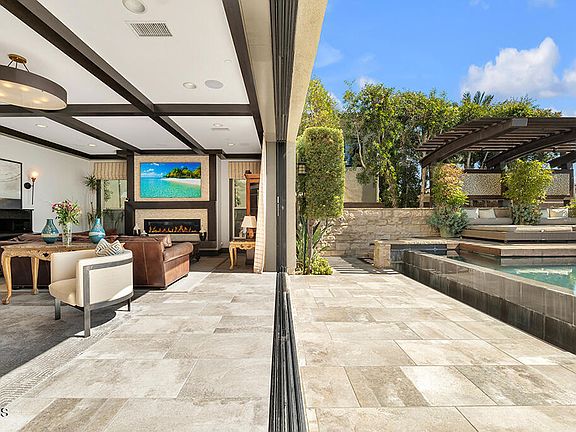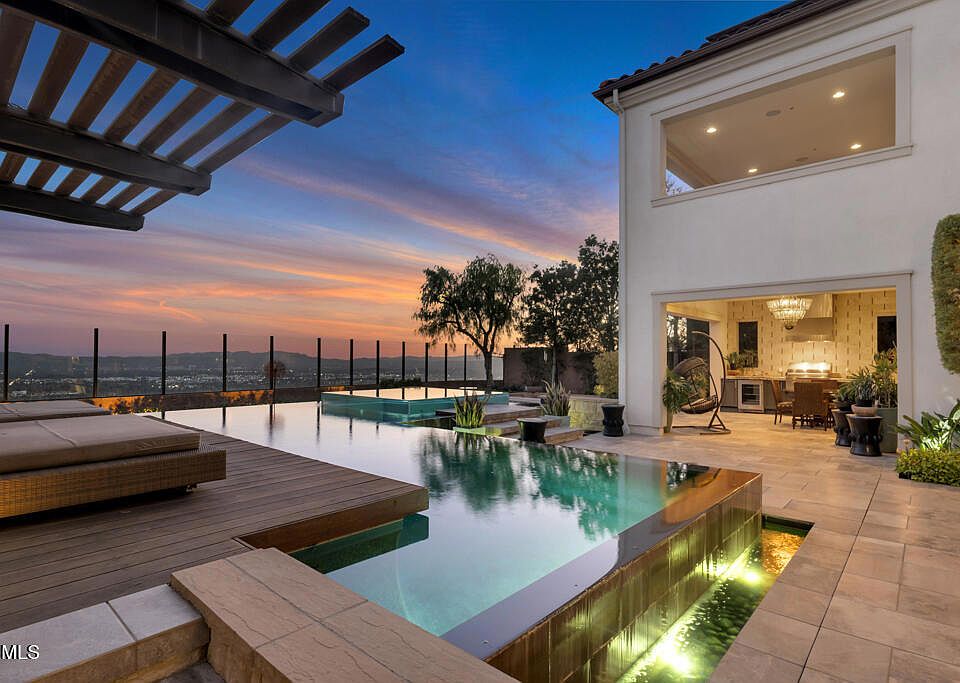 The Cahill at Westcliffe. This iconic Toll Brothers model inspired many dream homes. This one-of-a-kind home showcases elevated designer details, architectural artistry, and effortless serenity, all framed by sweeping, unobstructed views that stretch across the valley to the LA skyline. A dramatic entry leads you past a cascading water feature toward double doors framed by an arched portico opening to a breathtaking foyer crowned by a coffered dome ceiling with warm beams and a chandelier that draws the eye upward. Beyond the grand staircase, the show-stopping great room unites living, dining, and kitchen spaces beneath soaring beamed ceilings and retractable walls of glass where walls disappear and boundaries blur. Indoor and outdoor living flow seamlessly to the pool terrace, creating a natural extension of the home ideal for entertaining and sunset views.The true chef's kitchen defines modern luxury with dual waterfall islands, quartz countertops, custom cabinetry, and professional-grade Wolf appliances including a 6 burner range, double ovens, dual dishwashers, pot filler, and walk-in pantry. Expansive pocket doors open to the covered California room, complete with Wolf BBQ, dual beverage refrigerators, and prep counters, blending indoor sophistication with outdoor culinary entertaining. The backyard is a private, one of a kind resort escape where a striking infinity-edge pool meets an elevated glass-sided spa that appears to float above the skyline. Expansive decking and lounge areas invite open-air dining and relaxation surrounded by sculpted landscaping and water features. From this vantage point, city lights shimmer in the distance, and fireworks across the valley feel close enough to touch.Completing the first level is a home office with a stackable slider that opens to another water feature and a tucked-away guest ensuite offering comfort and privacy. Upstairs, a versatile loft with beverage bar and balcony connects two ensuite bedrooms and a convenient laundry room. The primary suite is a breathtaking sanctuary featuring coffered ceilings with dark beams that add structure and drama. Expansive glass sliders reveal a covered terrace with fireplace and sweeping city-lights. The luxurious spa bath pampers with dual vanities, soaking tub and expansive walk-in shower. Two dressing-room-style closets rival upscale boutiques with custom built-ins and stylish organization. Truly one of a kind. Dramatic, refined, gorgeous and endlessly peaceful .