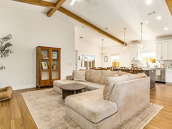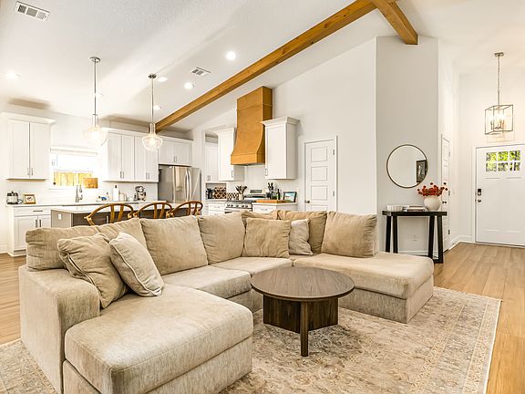 Step inside to find vaulted ceilings accented by custom cypress wood beams, creating a warm and inviting atmosphere throughout the open-concept living area. The gourmet kitchen features a gas range, butler's pantry, and premium finishes ideal for both everyday living and entertaining.