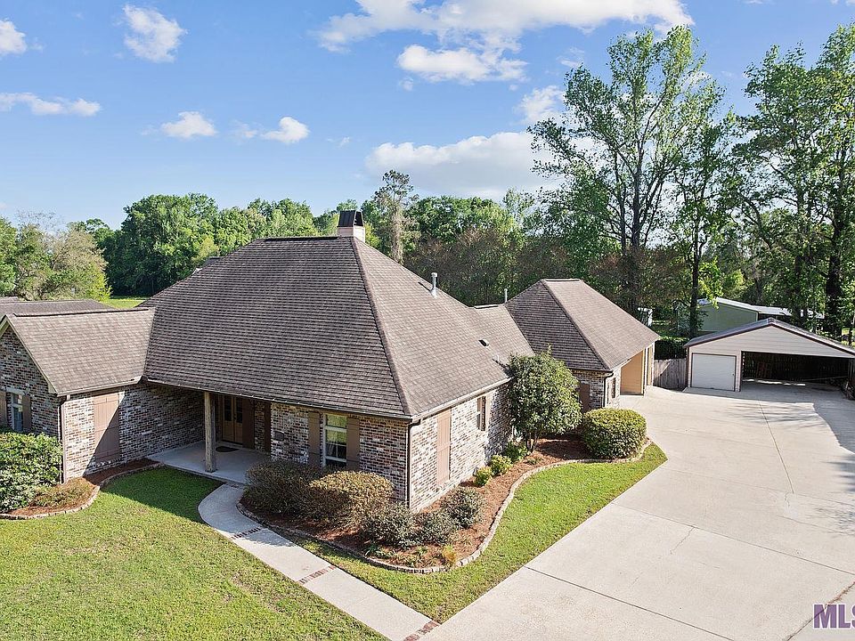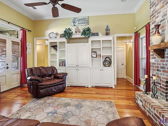 This exceptionally well-maintained CUSTOM-BUILT home is move-in ready offering 3BR, 3 FULL baths in the Zachary School District. Boasting over 2400 sf living space, the home is classic Acadian style with hints of A. Hays Town influence featuring wood beams, french doors, transoms above doors, heart pine floors, brick courtyard with fountain and much more! The open living space has high 12' ceilings in the family room, cozy fireplace and built-in bookshelves. The kitchen is DIVINE with a large island, gas stove, granite counters, large pantry and custom-built painted cabinets. There is a great FLEX SPACE (formal dining room) that could be used as a 4th bedroom, music room, craft room, or much more! Plus there is a large OFFICE with built-in counters and cabinets. The master suite is split from other bedrooms and has it's own cozy FIREPLACE and private access to the back porch through french doors to enjoy morning coffee. And the master closet is custom with built-in chests of drawers and plenty of shelving and shoe racks. Outdoor living is as special as inside! The back patio is fully screened to enjoy outdoor living year round! And the entire back yard has high wood fencing for privacy. There are two storage areas for the handyman and decked attic space above the oversized carport, that is accessed easily from stairs in the storage room. The metal shop offers additional parking plus, the second storage room and two 50amp plugs for the RV. Whole house generator WILL remain! Flood zone X, never flooded, flood insurance not required. And no HOA dues! Too many custom features to list here, so schedule your personal tour to check it out for yourself!