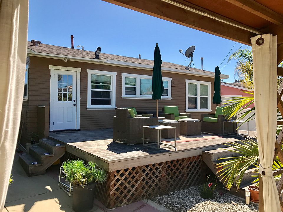 Absolutely a charmer and a stunner.Don't let the street fool you.This adorable home is tucked away behind newer vinyl fence, tall trees and dual pane windows! With it's open concept this home appear to be well over 1000 sq.ft . Step inside the living room and you'll be welcomed by refinished wood flooring and decorative fireplace.....Beautiful built-ins in he dining room, open pony wall to the kitchen with granite breakfast counter top. Spacious kitchen with stainless steel appliances, granite counter top, subway tile back splash and tiled flooring. Kitchen also features the laundry facility. Two good size rooms with a charming Jack and Jill full bath. Jaw dropping tropical back yard. A true paradise with its newer deck, pergola, pepper tree, storage shed. Tall plants provide excellent privacy on the front and the back as well. No garage, but plenty of parking on the driveway. Lot's of storage in the shed and under the home as well. Newer forced air heat and AC, recessed lighting...... Cute as bug!