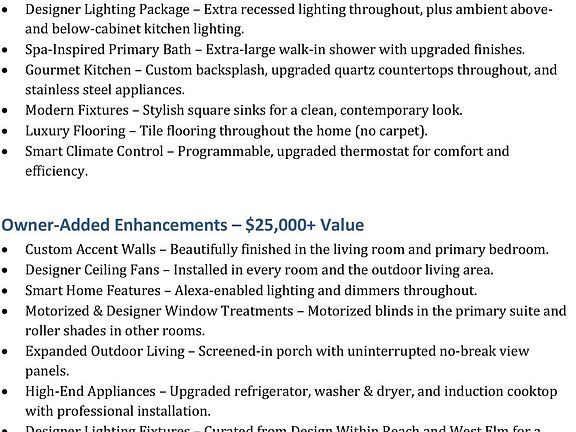 Accent walls in the living room and bedroom elevate the space, while Alexa-integrated lighting with dimmers adds convenience and ambiance. Every room, including the screened-in porch, features stylish ceiling fans. Window treatments include motorized blinds in the bedroom and roller shades in the main living areas. The top-of-the-line washer and dryer provide both style and performance, while the mounted TV adds to the home's turnkey appeal.