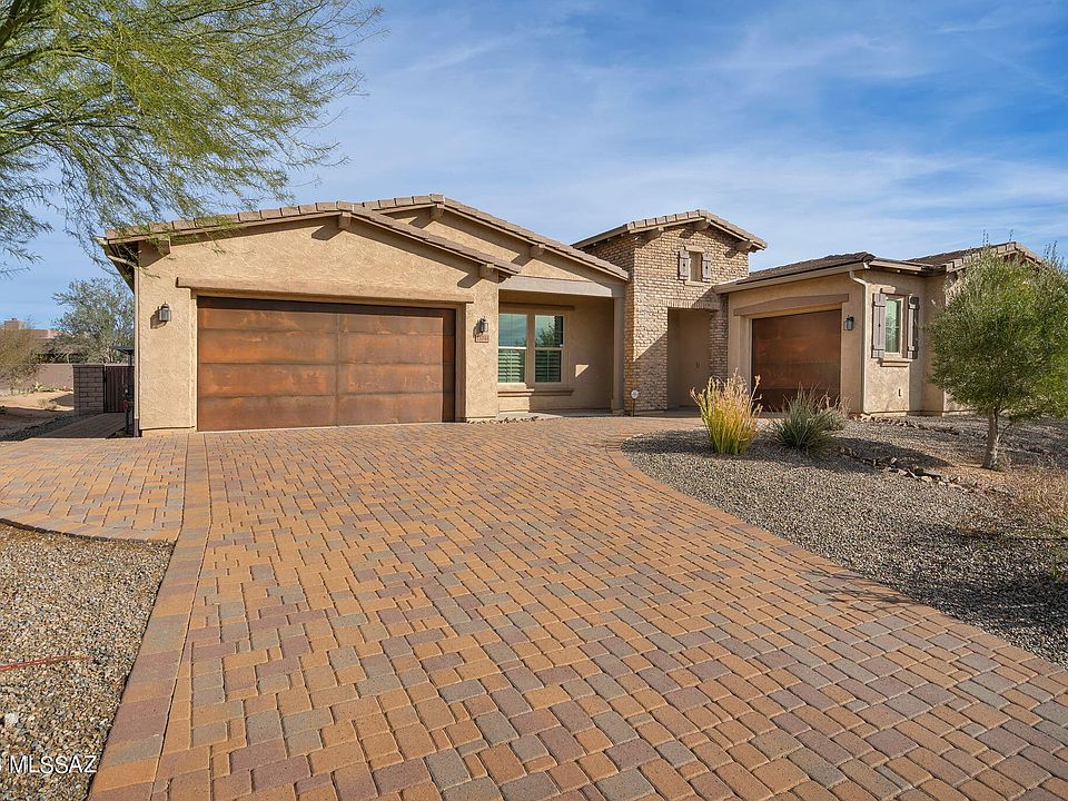 Welcome to Oro Valley and desirable Rancho Del Cobre neighborhood. This beauty features a 4-car garage, 0.64acre lot, 5 BR, shutters throughout, stone-accents, and custom wrought iron front door. Inside, you'll find a spacious family room boasting MULTI-SLIDING doors to the patio and pool, stylish tile floors, elegant light fixtures, and an inviting fireplace. Incredible kitchen offers many cabinets, granite counters, center island w/breakfast bar, high-end SS appliances, double ovens & walk-in pantry. Designer wall accents & open floorplan, excellent for indoor-outdoor living. The primary bedroom has TWO closets, patio access, & luxurious ensuite w/dual vanities. Resort-like backyard is one-of-a-kind! Enjoy the shimmering saltwater pool w/spa, covered patio, fire pit, & lovely pergola. The primary bedroom comes w/a soft carpet, patio access, luxurious ensuite w/dual vanities, soaking tub, and direct access to the laundry room. You don't want to miss this value.