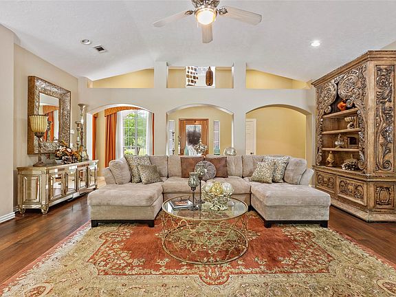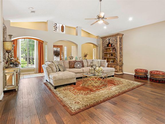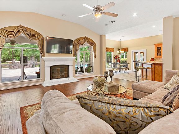 Exceptional one story brick home on a 2.5 acre beautifully wooded Corner lot with privacy fence. This country paradise is just minutes from all the amenities of The Woodlands. The slate walkway leads to the entrance where guests are greeted and enter the foyer, with a high ceiling and beautiful architectural design. The family room, with a gas log fireplace, has fabulous views of the outdoor oasis. The resort style salt water pool and spa, surrounded by slate decking, offers many seating areas for family and friends. The kitchen features granite countertops, stainless steel appliances, and a large butcher block island with gas cooktop and grill. The custom cabinetry has glass fronts and under cabinet lighting. A media room offers hours of enjoyment with a built-in entertainment center with speakers. A stone outdoor kitchen with dining bar has a refrigerator, gas grill and sink. A 24'x24' slab was poured to be a workshop. Another concrete area was built for parking an RV.