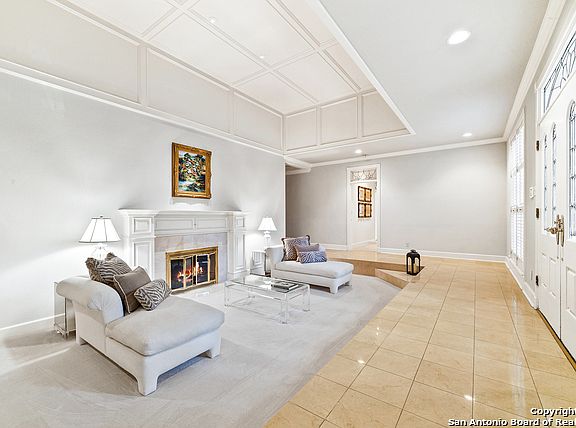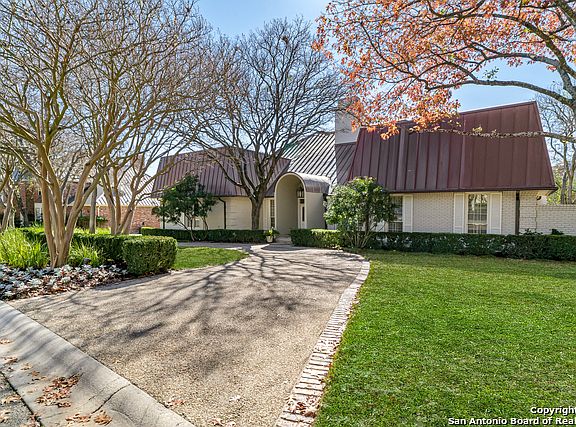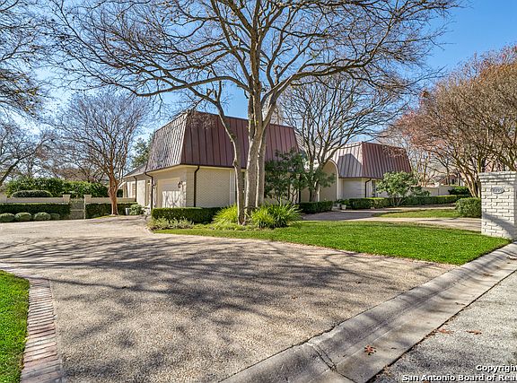 Circular drive entry welcomes you to this fabulous, traditional home . New copper roof installed 11/2016. Enter to a high ceiling, step down living room. This is a fabulous large 5 bedroom, 4 bath family home located in prestigious Elm Creek. Shuttered windows throughout. There are multiple living areas that are idea for a growing family to study, work, play, entertain. 5th bedroom could be an office or bedroom. Bedroom/bath located upstairs. Step down laundry room leads to an oversized garage. Upstairs is complete with office loaded with built-ins, room for exercise equipment plus play area. Living room/family room has see thru fireplace plus one in the master. Step down to the dining room with beautiful hardwood floors. Den has wall of French doors leading to a charming, brick floored covered patio. Ex-large master bedroom with his and hers bath plus fireplace. Jetted tub plus steam shower. The house sits on a beautiful extra large, level lot with large oak trees plus lovely landscaping.