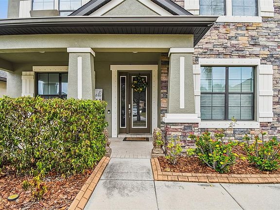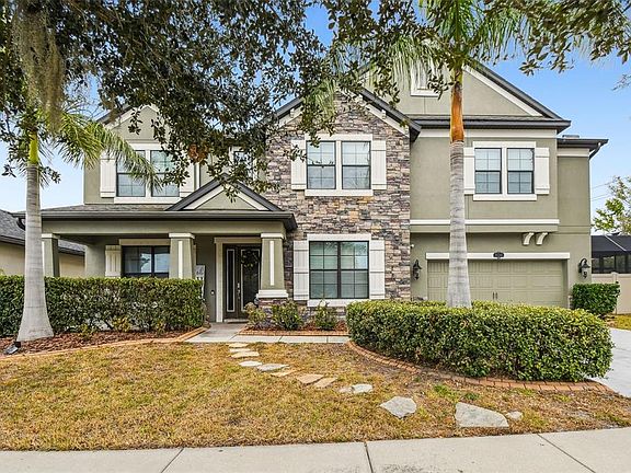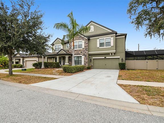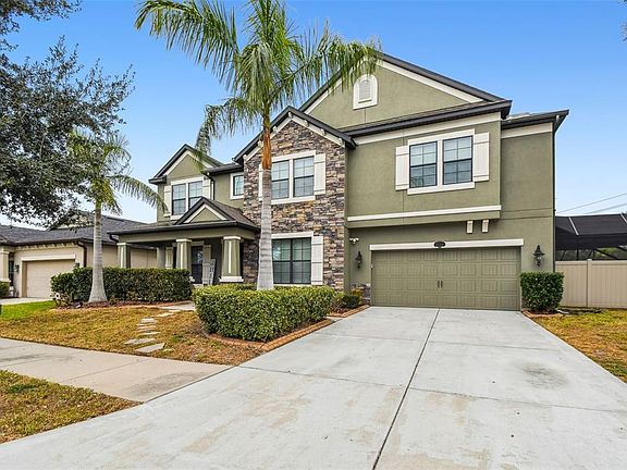 Welcome to this beautifully appointed two-story home offering 5 bedrooms, 4.5 baths, and more than 5,100 sq ft of exceptional living space. Situated on a 0.30 acre homesite, this property features a resort-style backyard with a beach entry pool, heated spa, a NEW pool enclosure, and a spacious paver patio, creating the perfect setting for entertaining or relaxing in complete privacy. Inside, the open-concept main living area combines a spacious family room, a large breakfast nook, and a stunning chef’s kitchen equipped with stainless steel appliances, quartz countertops, an oversized center island, tile backsplash, two walk-in pantries, and raised beige wood cabinetry. Large windows allow natural light to brighten the entire space, enhancing the home’s warm and inviting feel. The first floor also includes a dedicated office/study and a first floor bedroom with its own full bath, ideal for guests or multi generational living. A stylish half bath with travertine accents completes the main level. Upstairs, the private bedroom level features four additional bedrooms, including a spacious owner’s suite with dual walk-in closets, a soaking tub, and a separate glass enclosed shower. The remaining bedrooms are generously sized with walk-in closets and ceiling fans; two share a full hallway bath, while another enjoys its own ensuite bath. The second level also features a large movie theater room and an expansive loft/game room with a built-in wine bar, providing exceptional spaces for entertainment, relaxation, and recreation. Convenient second floor laundry adds ease to daily living. The home is equipped with a NEW Tesla solar power system, offering modern energy efficiency and long term utility savings. Outside, the fully fenced backyard provides privacy, ample space to play, and a dog run. A three car tandem garage with overhead storage and an extended driveway offers plentiful parking. Ideally located near the FishHawk Sports Complex, Big Bend YMCA, St. Joseph’s Hospital, diverse dining options, and multiple Publix locations, this home offers luxury, comfort, and convenience in one impressive package.