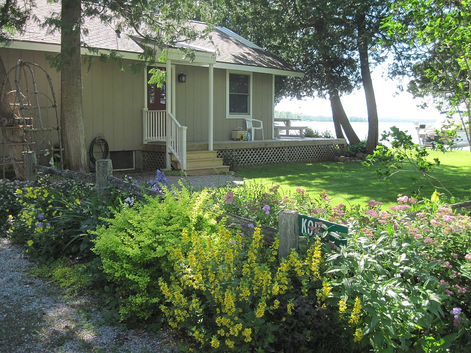 A chalet built in 1980 and has 864 square feet of living space plus a loft. The cottage consists of two bedrooms, 1 bath, kitchen, living great room and loft area. The interior main room has dark hardwood floors. The ceiling has light colored T&G ceiling. The kitchen has been updated with light cabinets, new counter top and vinyl flooring. Appliances are included. All the windows are thermos pane. The two sliders and clear story windows are newer. There are two bedrooms on the main level, the master bedroom has two closets and newer carpet. The second bedroom has newer carpet The bathroom has newer vinyl and counter top, new sink and toilet. There is a shower with no tub. The loft area can sleep 6 people and is intended to be a grandchildren's sleep area. It is reached by a ladder. There is storage and newer carpet in the loft. The utility area is very compact. The washer and dryer are stack able and located in a closet off of the kitchen. The furnace and hot water tank are in another closet area. There is a 7 block crawl space with outside entrance and has a sump pump. A wrap around deck is 2 years old, wraps around to both sliders and main entrance. Landscaping includes perennial gardens and trees. A tree house is located near the lake. A storage shed has wood siding that matches that of the swelling. The exterior of the dwelling has much curb appeal.