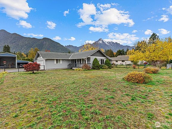 Experience breathtaking views of Whitehorse Mountain from this beautifully remodeled Darrington home! Every detail shines with brand-new paint, flooring, countertops, sinks, and hardware throughout. The open-concept kitchen, living, and dining area with vaulted ceilings creates a bright, inviting space for everyday living. Three comfortable bedrooms are thoughtfully tucked away for privacy. Outside, enjoy two garden sheds, an expansive greenhouse, covered RV parking, and a spacious garage for all your storage needs. A perfect blend of comfort, functionality, and natural beauty!