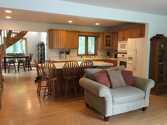 Riverfront with Country charm! Beautiful setting with mature trees near Forest Preserve. Pella Windows, Oak spiral staircase to 2nd floor, open 2 Story Sun/Dining room, 4 decks and much more. Oversized garage 30x24. Wildlife galore in this setting! 2 Bedrooms & bath on the main floor, large Master Suite Loft, full bath w/whirlpool, glass shower & double vanity. 2nd floor also features laundry room w/deck and large WIC. Very open floor plan great for entertaining! House roof 2001-30 Yr. Garage roof 2013. 16" insulation in attic. Wonderful and unique property.