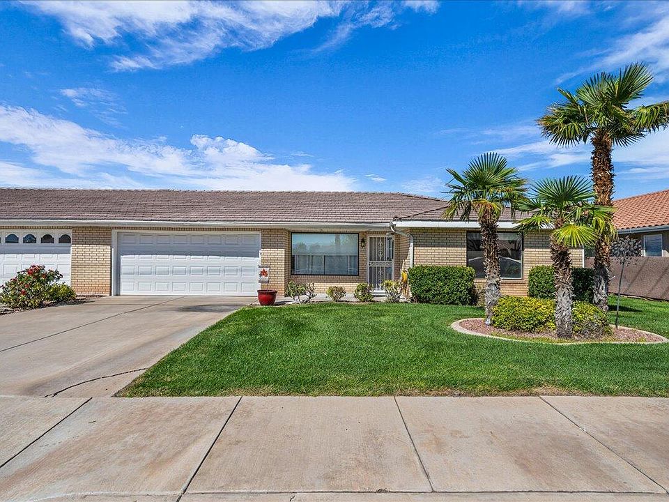 Well maintained all brick townhome located in 55+ community of Palm Meadows. The open concept design features a modern kitchen with granite countertops, moveable island and added oak cabinets and drawers for extra storage. Primary suite offers an ensuite bath with double sinks, tile shower and tile floors with additional custom cabinetry for added storage. Additional features include vaulted ceilings, LVP flooring, central vacuum, water softener and extra large capacity water heater. The backyard is a private retreat with low maintenance turf for year around enjoyment. A versatile enclosed patio room with insulated walls and abundant windows provides the perfect space for an art studio, office or den. The backyard also includes a large lifetime storage shed, while the two car garage is equipped with cabinetry on both sides for extra storage. Conveniently located just a few blocks from Utah Tech University, Intermountain Hospital, grocery store, shops, restaurants. Homeowners enjoy a private year-round indoor pool and spa. Swimming and hot tub are located just a few yards from the home's custom iron back gate.
