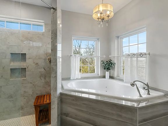 Main-level primary suite with fireplace, jacuzzi, and walk-in shower