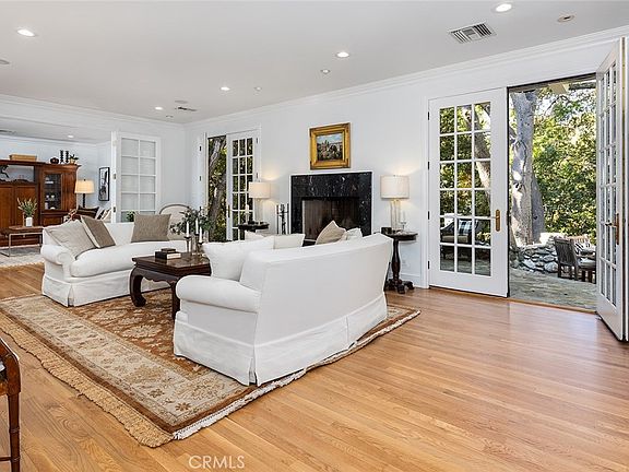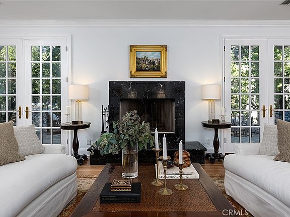 Nestled just above the Rose Bowl Stadium and Brookside Golf Course, the gated property is discreetly tucked behind a river rock wall and charming oleander privacy hedge. This gracious traditional-style home awaits its next chapter. Upon entry, the center hall design reveals beautifully hand-molded arched doorways that lead into a welcoming living room. From here, you can flow seamlessly through the home or step out through the French doors onto a serene, oak-canopied patio—a perfect setting for reading by the outdoor fireplace or savoring an al fresco meal.