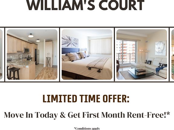 AboutLocated in Ottawa's West end, Kanata Lakes is close to parks, and shopping options such as the Tanger Outlet Mall, Kanata Lakes Golf & Country Club, and Canadian Tire Centre, home of the Ottawa Senators. These luxurious suites offer 6 appliances, hardwood floors, in-suite laundry, and granite countertops. Other amenities include an elegant private clubhouse with a professional gym, an indoor saltwater pool, a games room, a lounge, and central security systems. Enjoy the best of luxurious living in Ottawa's prestigious neighbourhood, Kanata Lakes.William's Court open-concept apartments range from studio to one-bedroom, one-bedroom + den, two-bedroom and two-bedoom+den suites.Community Amenities